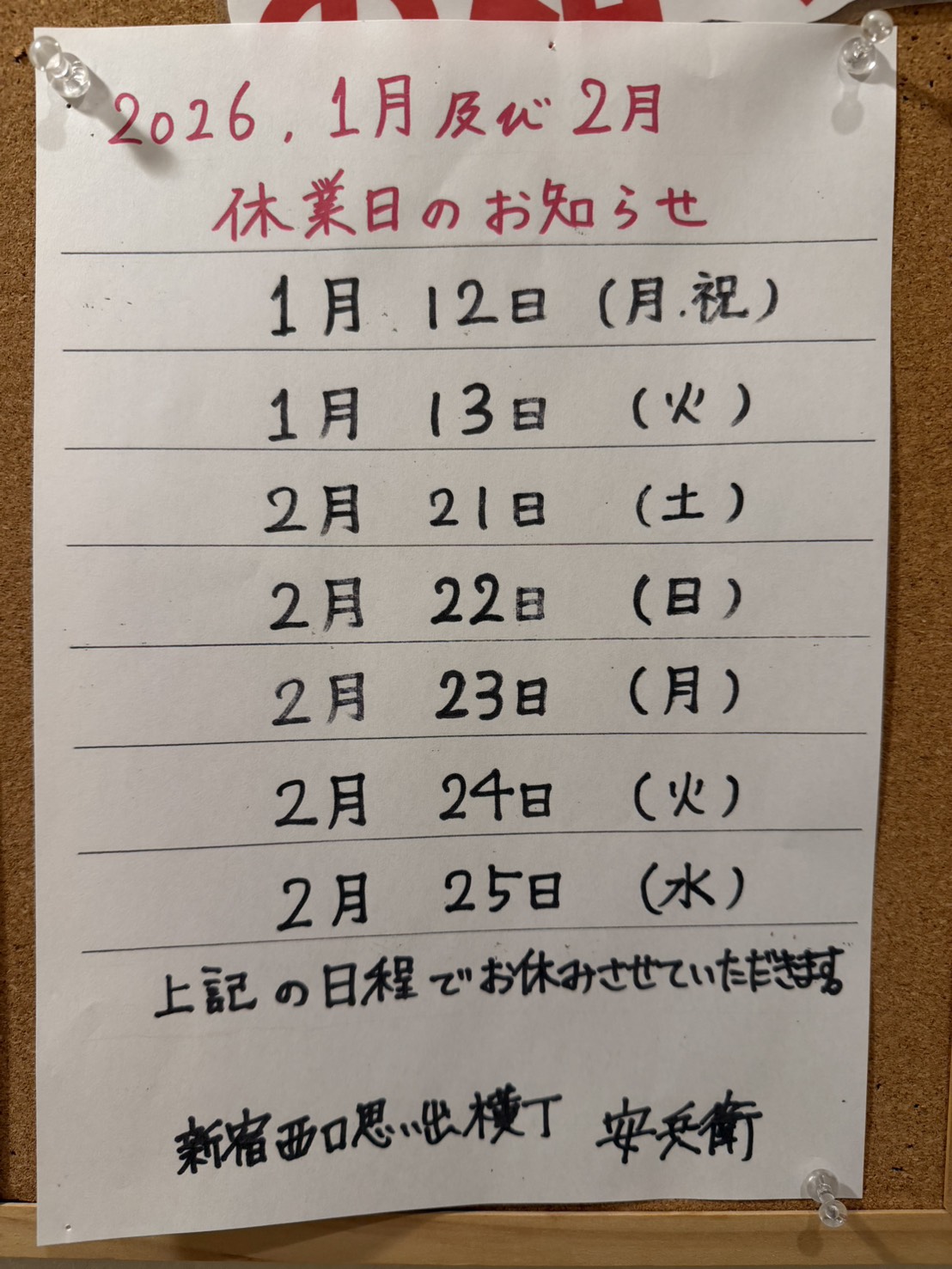 いつも安兵衛本店、別館共に御利用いただきましてありがとうございます!!夏季休暇をいただきます。期間8/25-8 […]